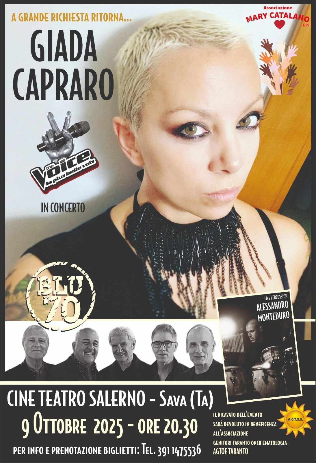Sul palco i Blu 70 e il percussionista Alessandro Monteduro. Il ricavato sarà devoluto all’A.G.T.O.E. – Genitori Taranto Onco Ematologia.
