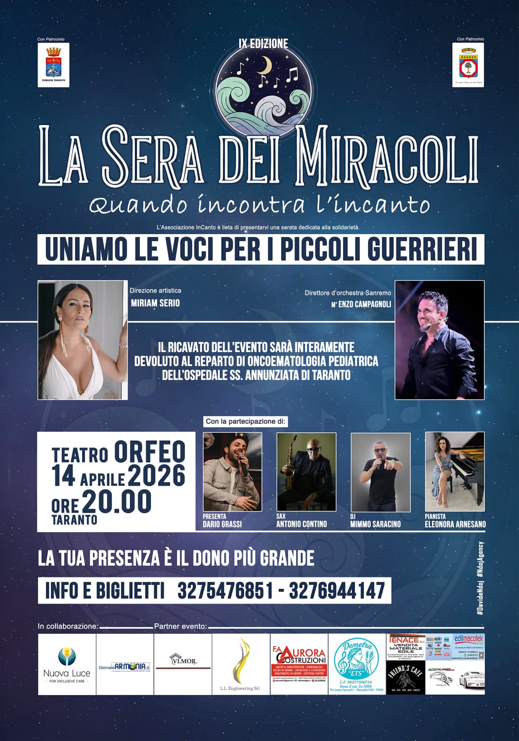 Una serata capace di unire spettacolo, sensibilità artistica e impegno concreto verso chi affronta ogni giorno una delle battaglie più difficili. Martedì 14 aprile 2026, alle ore 20.00, il Teatro Orfeo di Taranto ospiterà la IX edizione de “La Sera dei Miracoli – Quando incontra l’incanto”, appuntamento che si conferma tra i momenti più significativi del panorama solidale cittadino, con un messaggio forte e chiaro già racchiuso nel claim scelto per questa edizione: “Uniamo le voci per i piccoli guerrieri”.